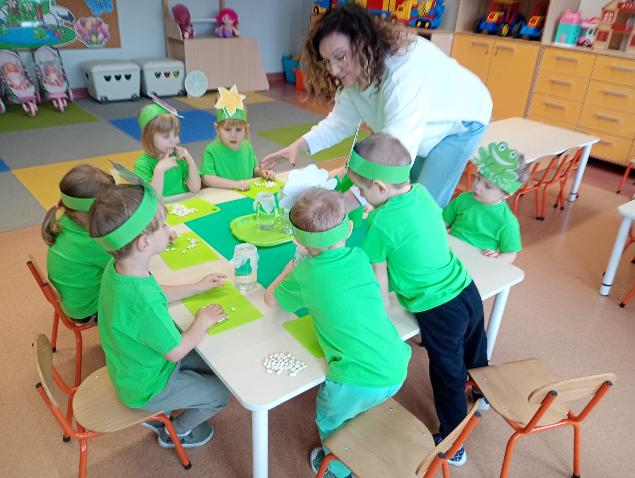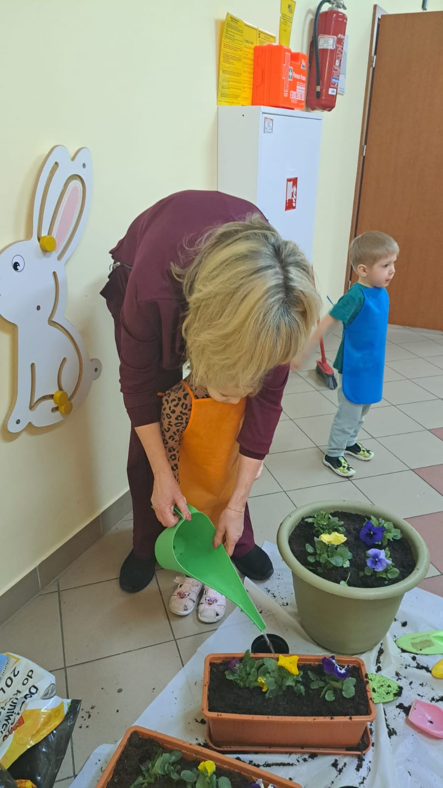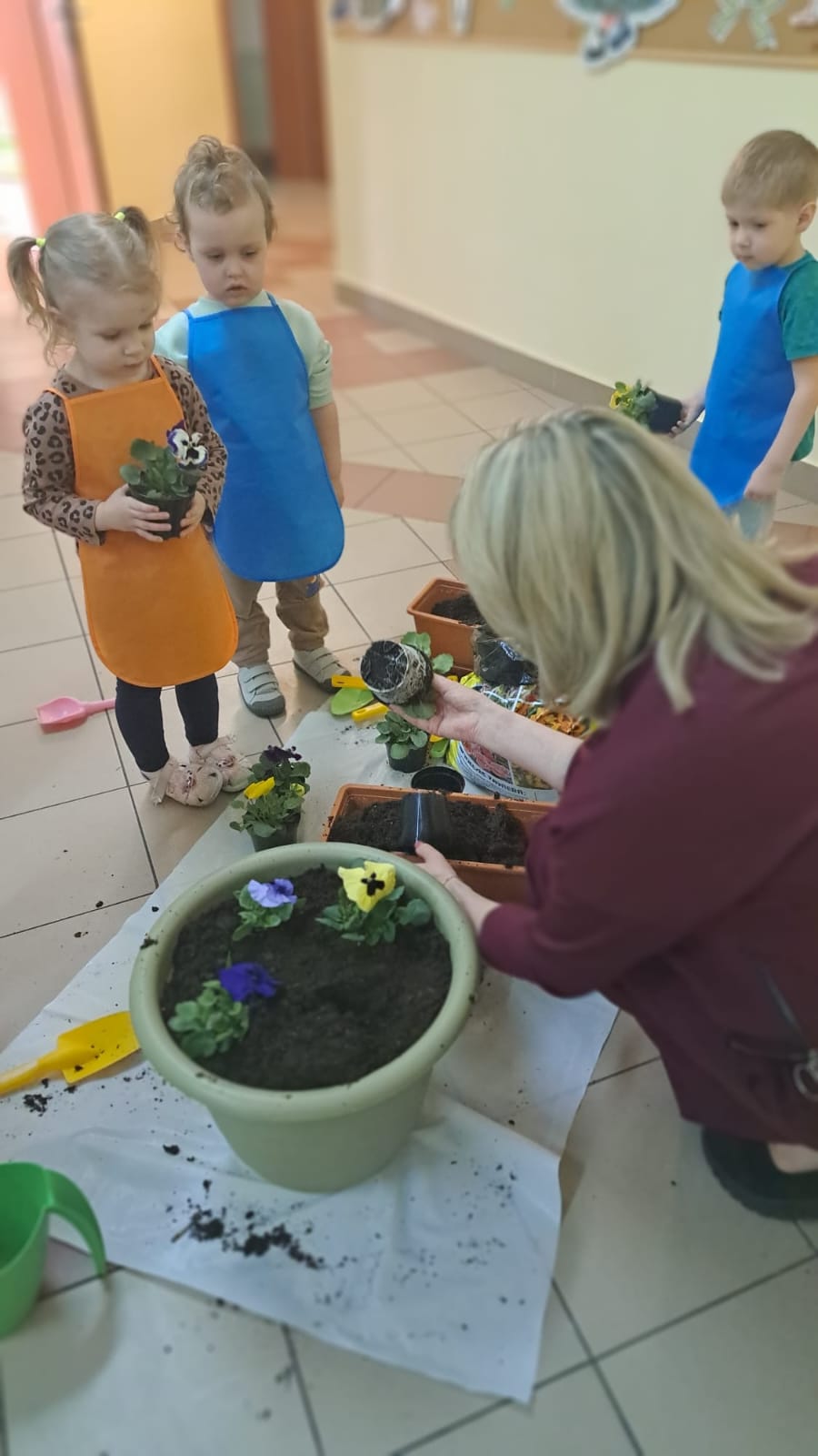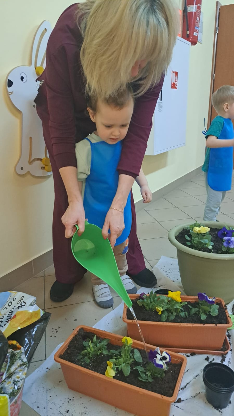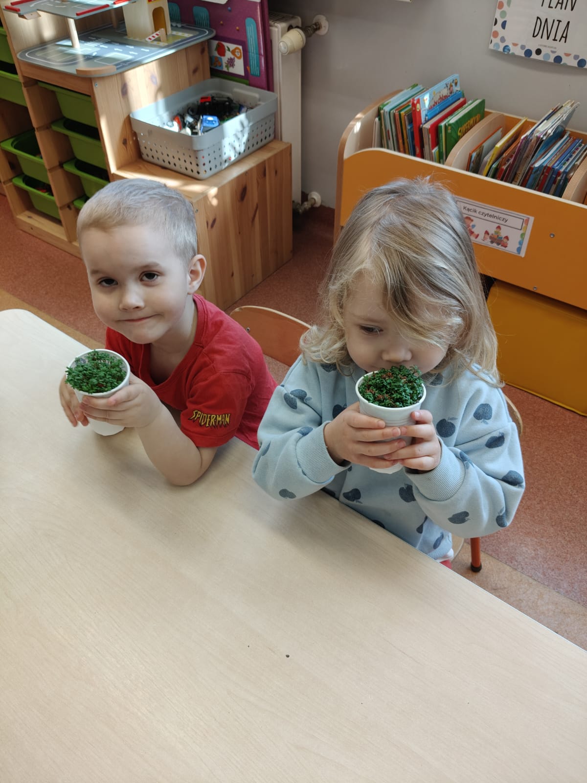 Wraz z nadejściem wiosny z powodzeniem założyliśmy zielony kącik na parapecie okiennym. Dzieci przy niewielkiej pomocy, przygotowały niezbędny warsztat pracy tj.: ziemię, nasiona, cebulki, wodę. Następnie samodzielnie zasiały nasiona rzeżuchy w pojemniczkach z namoczoną watą, w słoiczkach z wodą na gazie ziarenka fasoli, a w pojemniczkach z ziemią zasadziły cebulki i kolorowe bratki. Założone uprawy dzieci pielęgnowały, podlewał oraz każdego dnia obserwowały zmiany zachodzące w roślinach, zauważały kiełkowanie, wzrost łodyg, liści, dowiedziały się, co jest potrzebne roślinom do wzrostu. Miały możliwość zapoznania się z różnymi rodzajami nasion oraz dowiedziały jakie są sposoby uprawy roślin i ich pielęgnacji. Od momentu zakładania zielonego ogródka, doświadczały wielu wrażeń zmysłowych. Przygotowanie podłoża, dotykanie różnych części roślin, czynności pielęgnacyjne – to stymulacja zmysłu dotyku. Przy sprawdzaniu twardości nasion, przy sadzenie aktywowały czucie głębokie. Przyglądanie się efektom hodowli, wyszukiwanie zmian i innych ciekawostek pobudzało do pracy zmysł wzroku, nie zapominaliśmy także o zmysłach powonienia i smaku. Uprawa ogródka ziołowego była również naturalną okazją do rozmów z dziećmi o zasadach zdrowego żywienia. Udział w projekcie był dla dzieci wyzwaniem, które stawiało je w roli aktywnych i czujnych obserwatorów otaczającego świata. Rozbudzało zainteresowania, mobilizowało do poszukiwania odpowiedzi na różne pytania, uczyło twórczego myślenia i zaspokajało potrzeby poznawcze. Dzieci uczyły się planowania i organizacji pracy, współpracy, pozytywnej komunikacji. Doświadczały radości, satysfakcji, oraz wzmacniały poczucie własnej wartości.