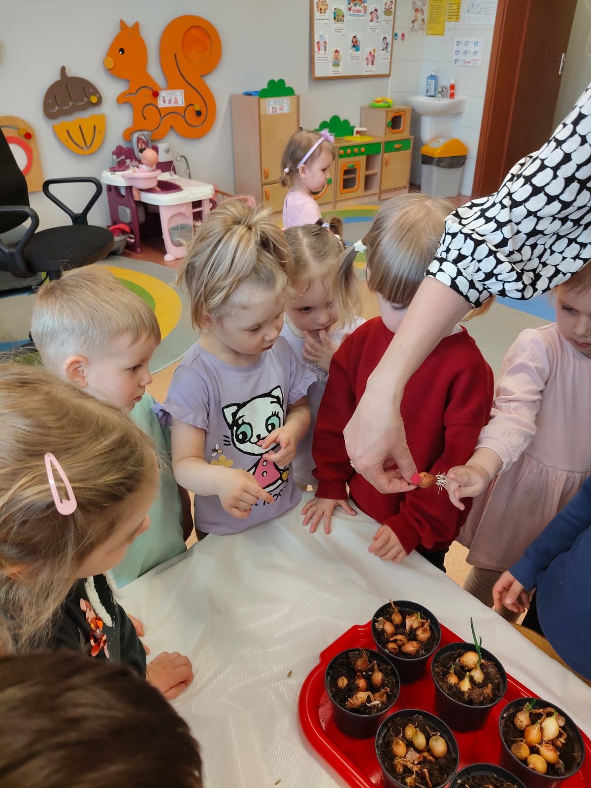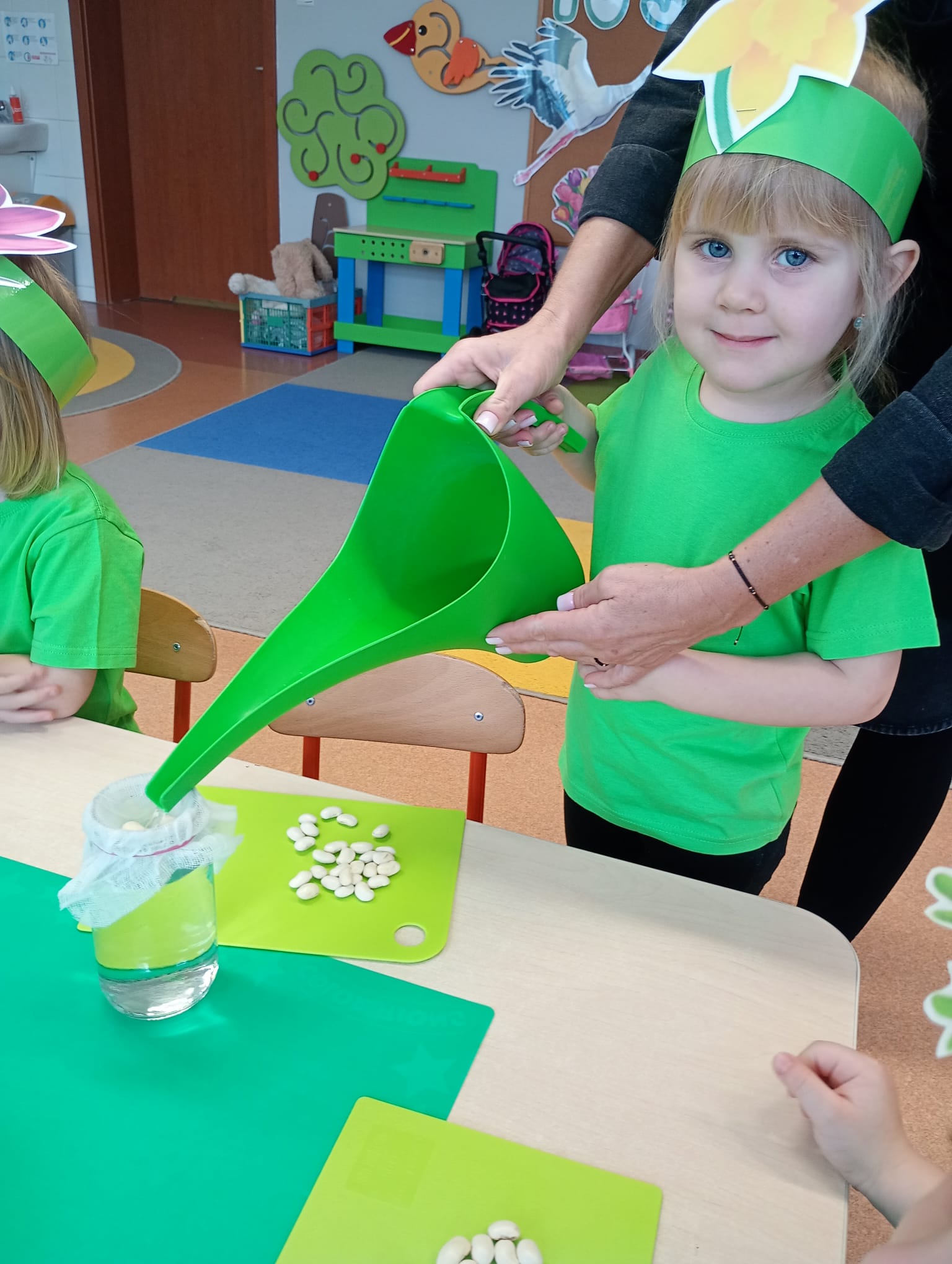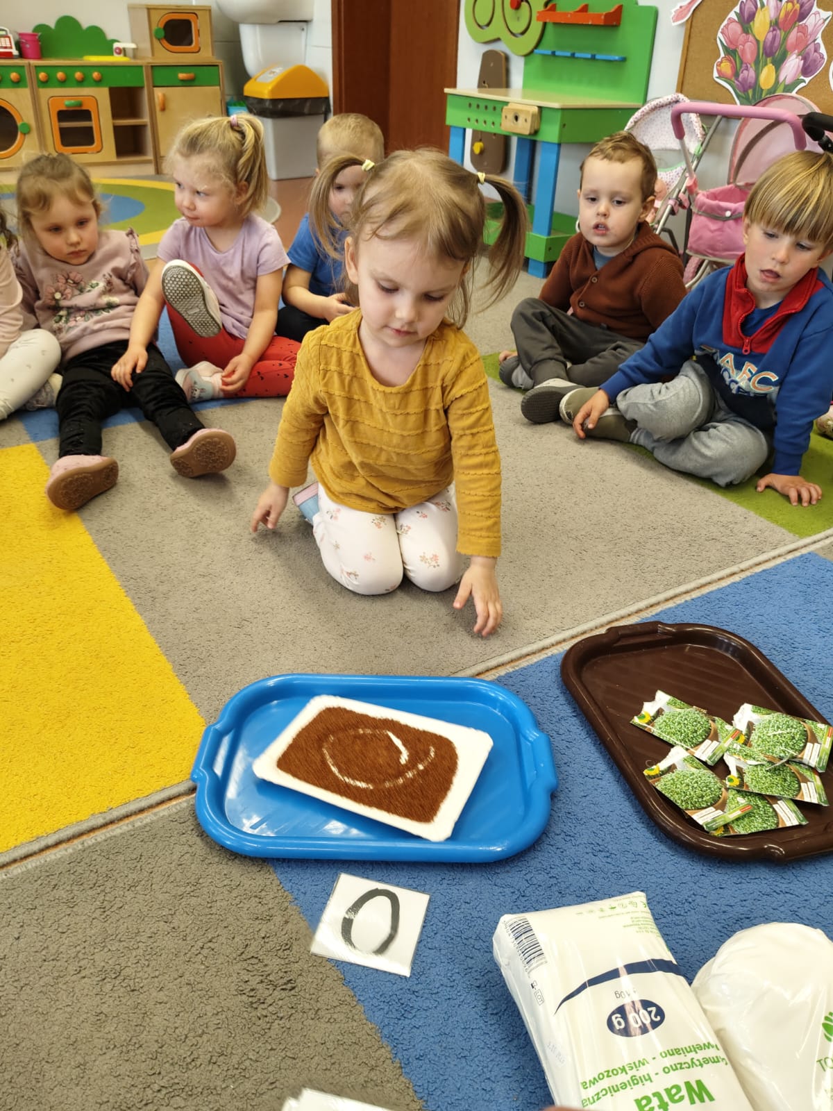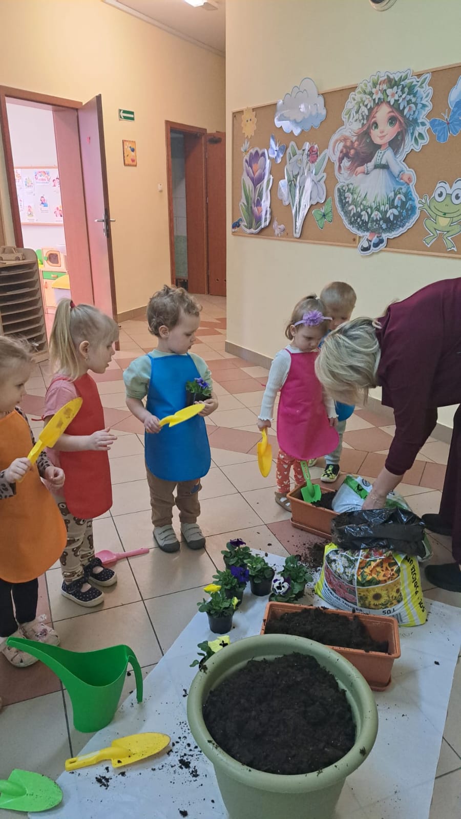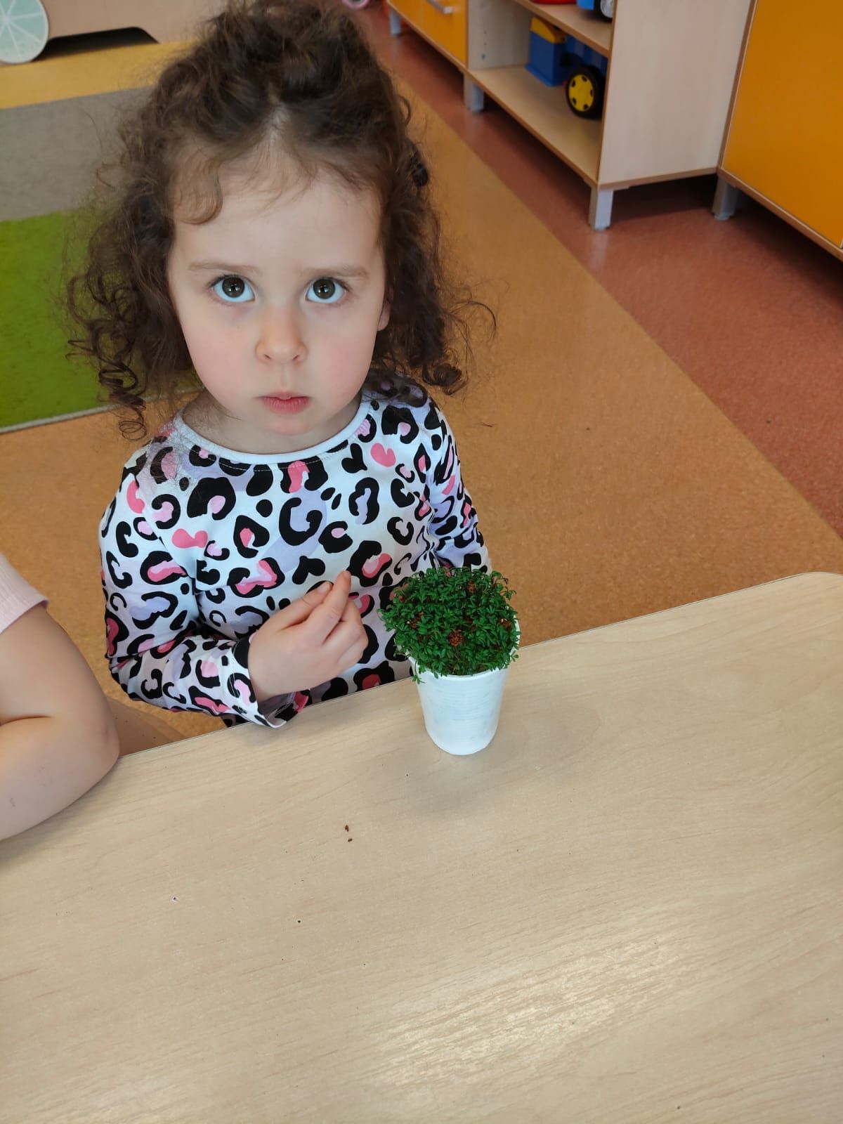 Wraz z nadejściem wiosny z powodzeniem założyliśmy zielony kącik na parapecie okiennym. Dzieci przy niewielkiej pomocy, przygotowały niezbędny warsztat pracy tj.: ziemię, nasiona, cebulki, wodę. Następnie samodzielnie zasiały nasiona rzeżuchy w pojemniczkach z namoczoną watą, w słoiczkach z wodą na gazie ziarenka fasoli, a w pojemniczkach z ziemią zasadziły cebulki i kolorowe bratki. Założone uprawy dzieci pielęgnowały, podlewał oraz każdego dnia obserwowały zmiany zachodzące w roślinach, zauważały kiełkowanie, wzrost łodyg, liści, dowiedziały się, co jest potrzebne roślinom do wzrostu. Miały możliwość zapoznania się z różnymi rodzajami nasion oraz dowiedziały jakie są sposoby uprawy roślin i ich pielęgnacji. Od momentu zakładania zielonego ogródka, doświadczały wielu wrażeń zmysłowych. Przygotowanie podłoża, dotykanie różnych części roślin, czynności pielęgnacyjne – to stymulacja zmysłu dotyku. Przy sprawdzaniu twardości nasion, przy sadzenie aktywowały czucie głębokie. Przyglądanie się efektom hodowli, wyszukiwanie zmian i innych ciekawostek pobudzało do pracy zmysł wzroku, nie zapominaliśmy także o zmysłach powonienia i smaku. Uprawa ogródka ziołowego była również naturalną okazją do rozmów z dziećmi o zasadach zdrowego żywienia. Udział w projekcie był dla dzieci wyzwaniem, które stawiało je w roli aktywnych i czujnych obserwatorów otaczającego świata. Rozbudzało zainteresowania, mobilizowało do poszukiwania odpowiedzi na różne pytania, uczyło twórczego myślenia i zaspokajało potrzeby poznawcze. Dzieci uczyły się planowania i organizacji pracy, współpracy, pozytywnej komunikacji. Doświadczały radości, satysfakcji, oraz wzmacniały poczucie własnej wartości.