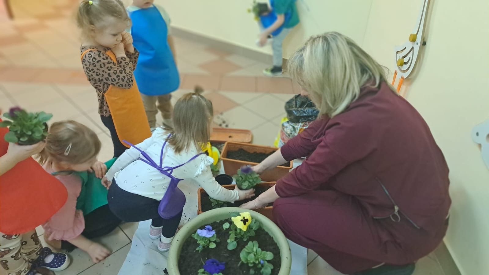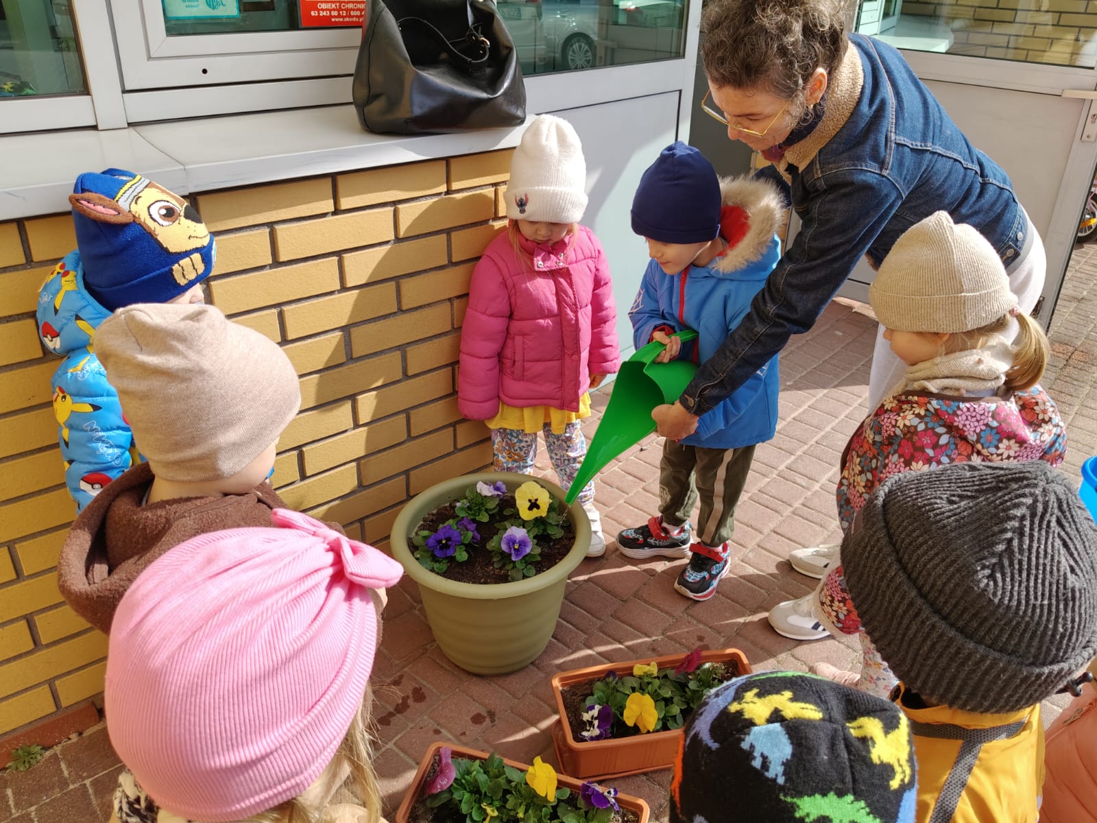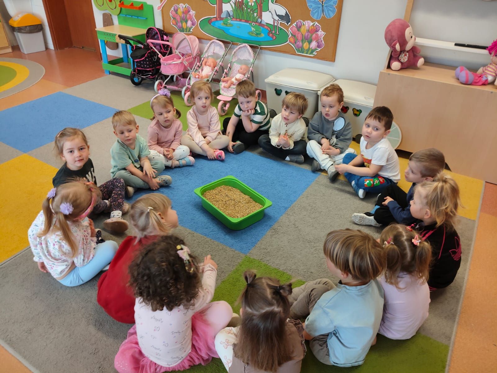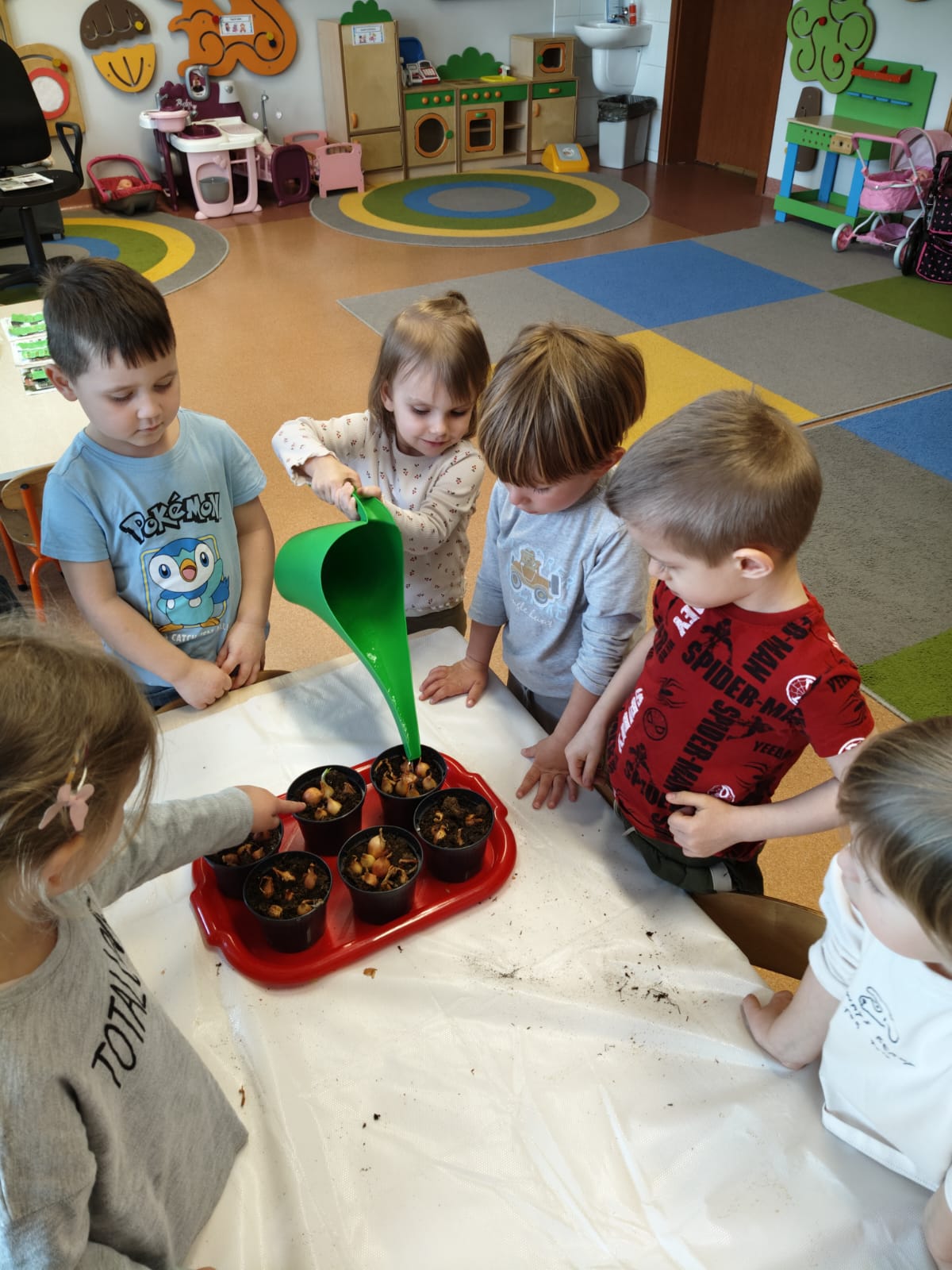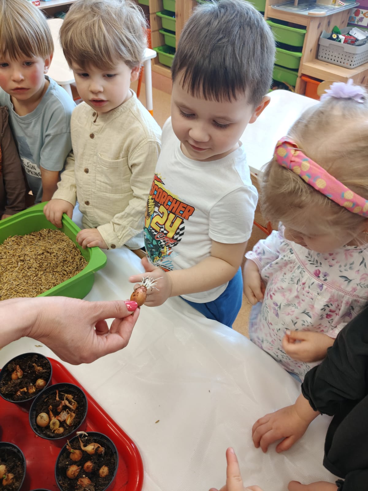 Wraz z nadejściem wiosny z powodzeniem założyliśmy zielony kącik na parapecie okiennym. Dzieci przy niewielkiej pomocy, przygotowały niezbędny warsztat pracy tj.: ziemię, nasiona, cebulki, wodę. Następnie samodzielnie zasiały nasiona rzeżuchy w pojemniczkach z namoczoną watą, w słoiczkach z wodą na gazie ziarenka fasoli, a w pojemniczkach z ziemią zasadziły cebulki i kolorowe bratki. Założone uprawy dzieci pielęgnowały, podlewał oraz każdego dnia obserwowały zmiany zachodzące w roślinach, zauważały kiełkowanie, wzrost łodyg, liści, dowiedziały się, co jest potrzebne roślinom do wzrostu. Miały możliwość zapoznania się z różnymi rodzajami nasion oraz dowiedziały jakie są sposoby uprawy roślin i ich pielęgnacji. Od momentu zakładania zielonego ogródka, doświadczały wielu wrażeń zmysłowych. Przygotowanie podłoża, dotykanie różnych części roślin, czynności pielęgnacyjne – to stymulacja zmysłu dotyku. Przy sprawdzaniu twardości nasion, przy sadzenie aktywowały czucie głębokie. Przyglądanie się efektom hodowli, wyszukiwanie zmian i innych ciekawostek pobudzało do pracy zmysł wzroku, nie zapominaliśmy także o zmysłach powonienia i smaku. Uprawa ogródka ziołowego była również naturalną okazją do rozmów z dziećmi o zasadach zdrowego żywienia. Udział w projekcie był dla dzieci wyzwaniem, które stawiało je w roli aktywnych i czujnych obserwatorów otaczającego świata. Rozbudzało zainteresowania, mobilizowało do poszukiwania odpowiedzi na różne pytania, uczyło twórczego myślenia i zaspokajało potrzeby poznawcze. Dzieci uczyły się planowania i organizacji pracy, współpracy, pozytywnej komunikacji. Doświadczały radości, satysfakcji, oraz wzmacniały poczucie własnej wartości.
