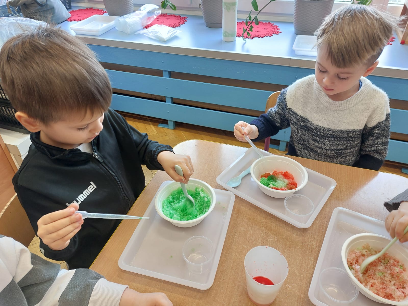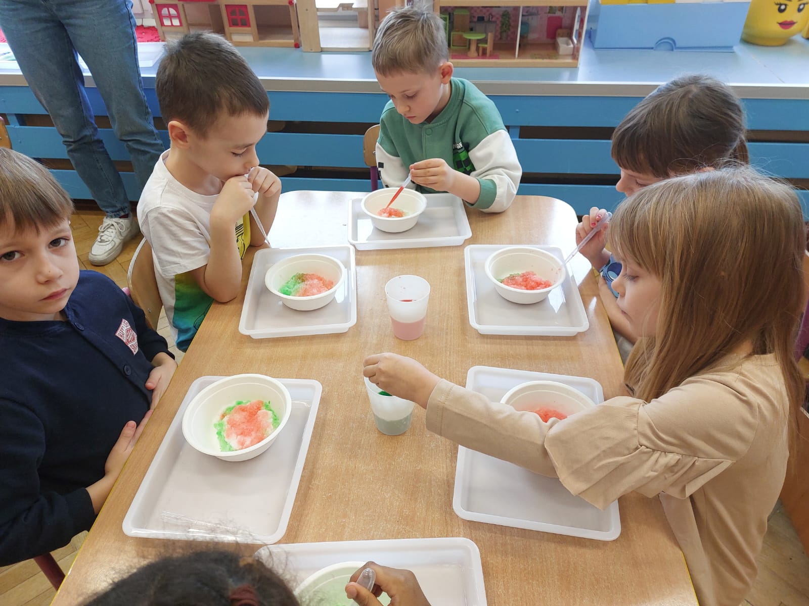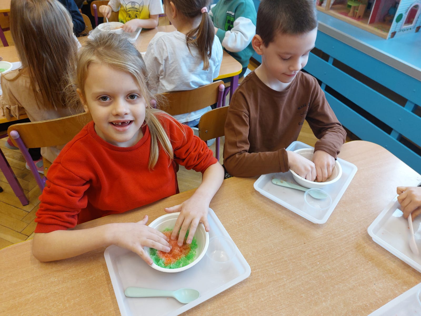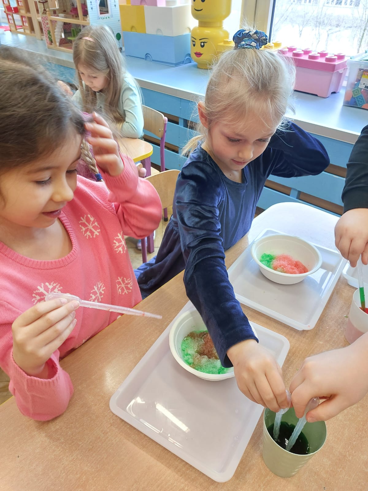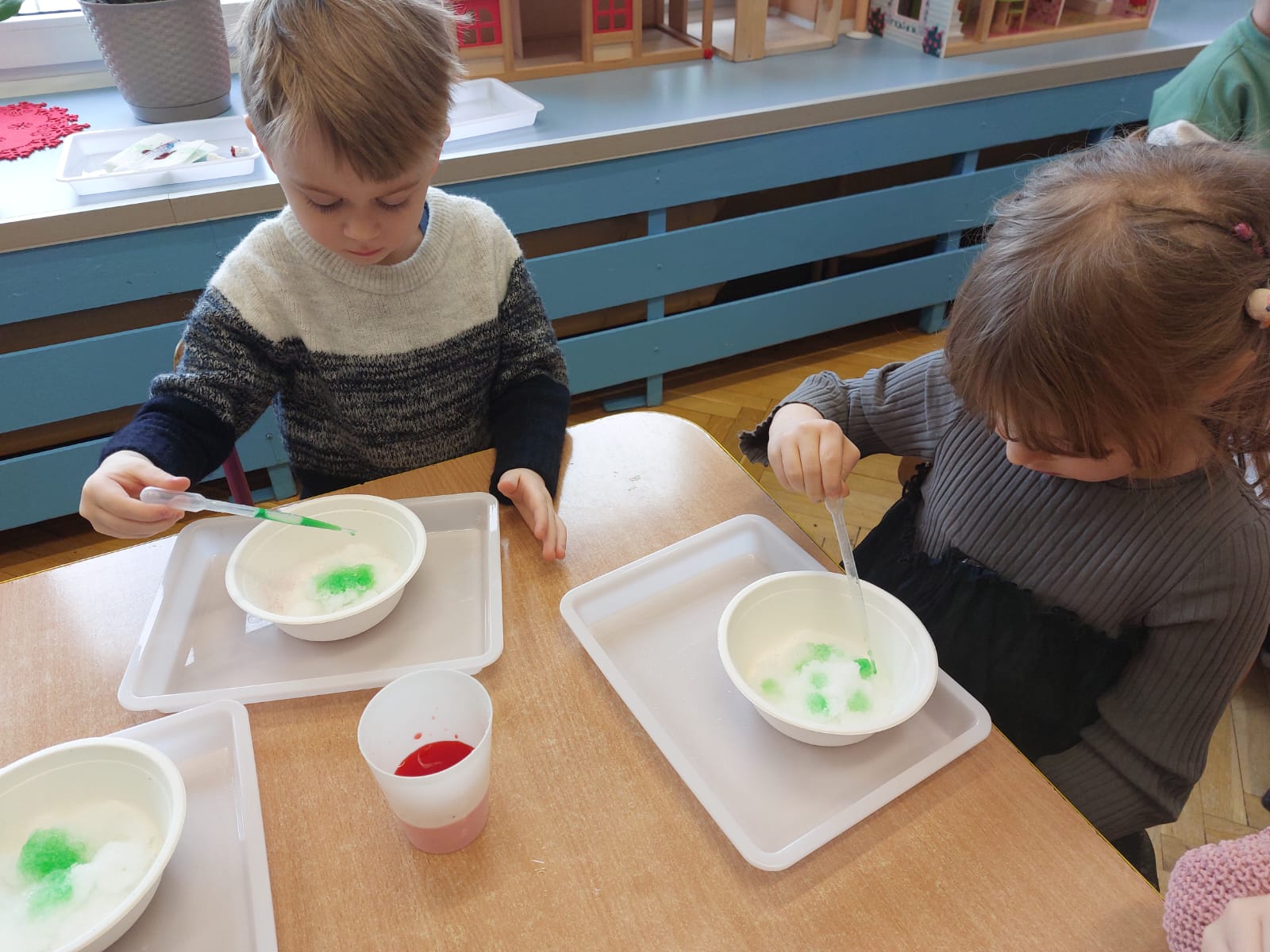 Zima to doskonały czas na odkrywanie fascynujących zjawisk przyrodniczych! Dzieci z grupy V miały okazję dziś uczestniczyć w niezwykłych eksperymentach, które wywołały prawdziwy efekt WOW! Dzięki nim nauka stała się świetną zabawą, a mali odkrywcy byli zachwyceni. Dzisiejsze eksperymenty to „kolorowe śnieżynki” i „sztuczny śnieg”. Pierwszy z nich polegał na połączeniu kleju z barwnikiem i płynem do naczyń, co dało piękne kolorowe płatki. Drugi eksperyment polegał na stworzeniu sztucznego białego i kolorowego śniegu, który po połączeniu poliakrylu sodu z wodą był biały, następnie dzieci dodały kolorowy barwnik, który zmienił śnieg w kolor. To były prawdziwe czary…. Te zimowe eksperymenty pokazały dzieciom, że nauka może być ekscytująca i pełna niespodzianek! To była świetna okazja do rozwijania kreatywności oraz zdobywania wiedzy poprzez zabawę.