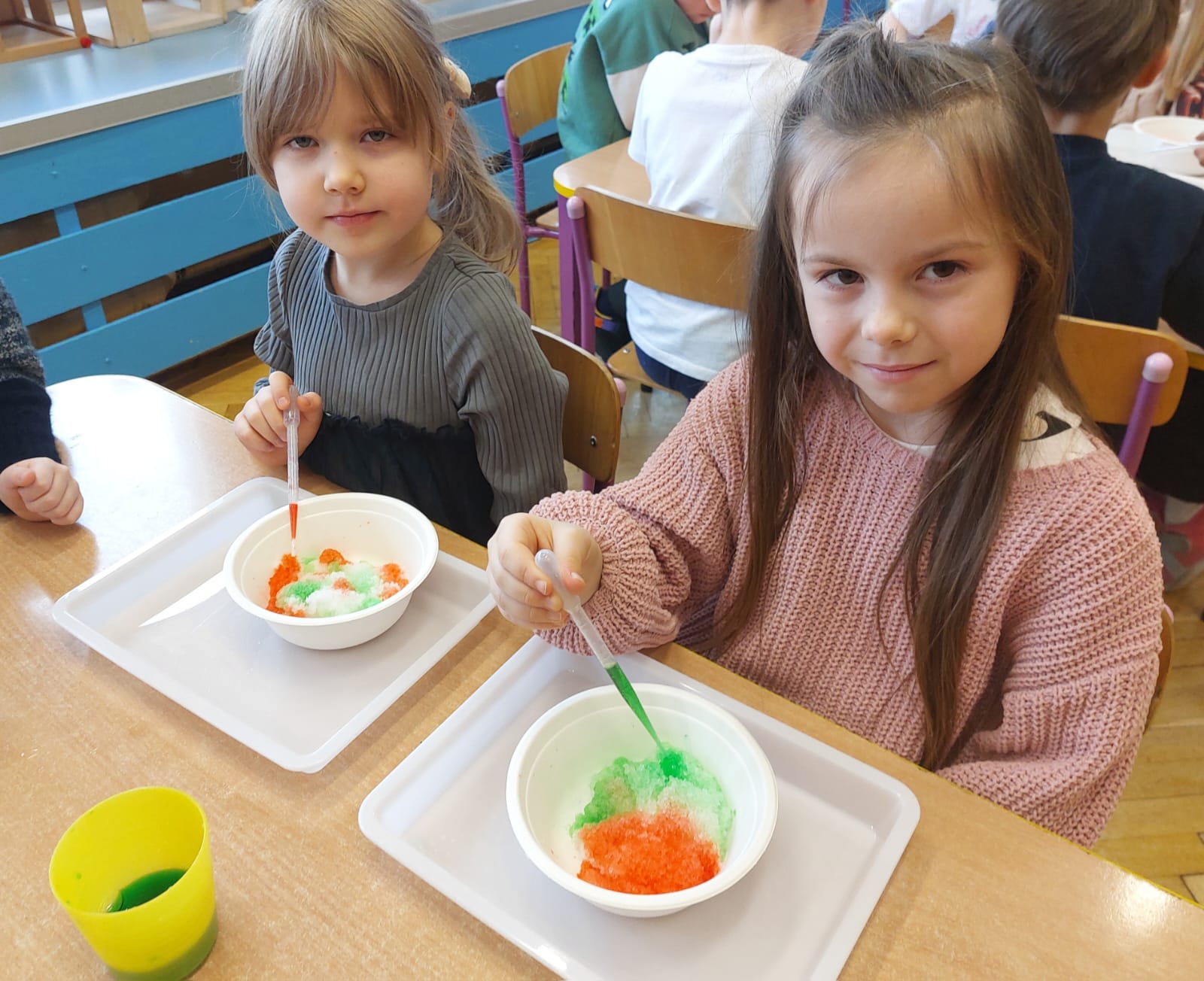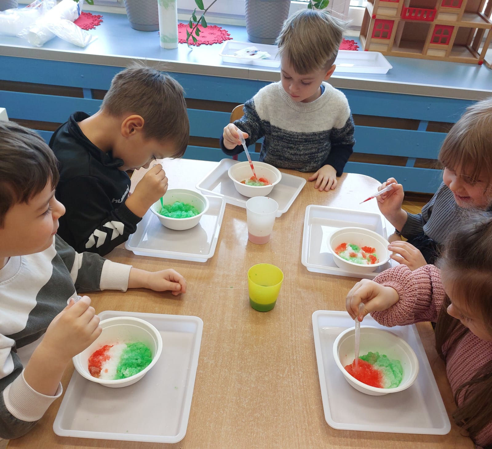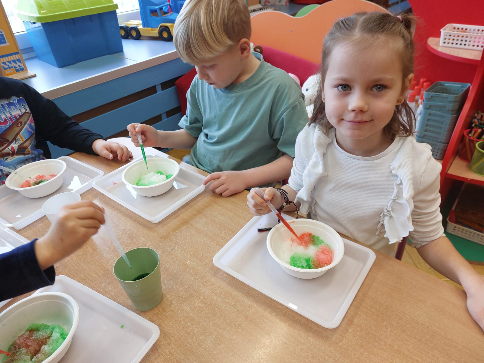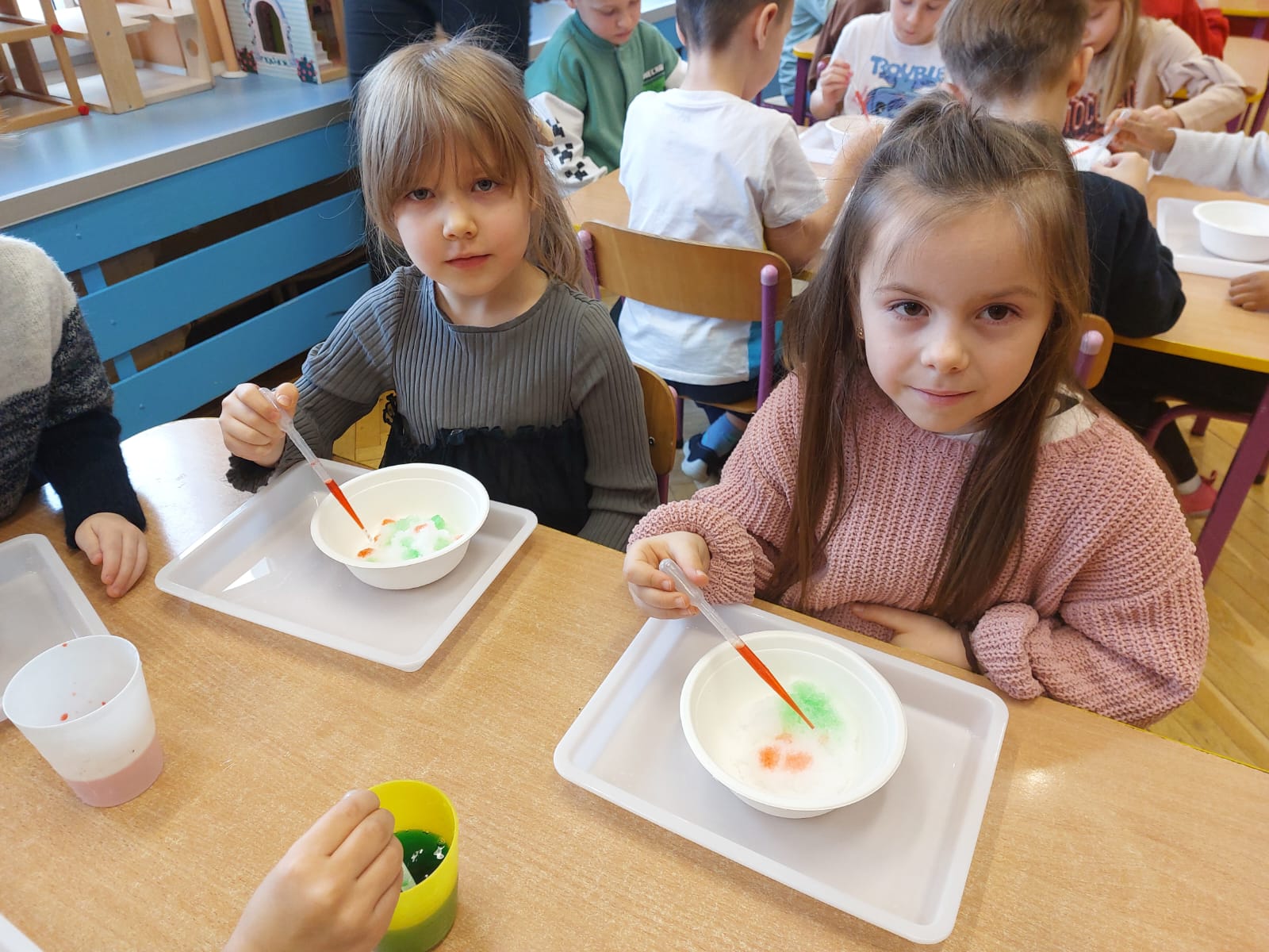 Zima to doskonały czas na odkrywanie fascynujących zjawisk przyrodniczych! Dzieci z grupy V miały okazję dziś uczestniczyć w niezwykłych eksperymentach, które wywołały prawdziwy efekt WOW! Dzięki nim nauka stała się świetną zabawą, a mali odkrywcy byli zachwyceni. Dzisiejsze eksperymenty to „kolorowe śnieżynki” i „sztuczny śnieg”. Pierwszy z nich polegał na połączeniu kleju z barwnikiem i płynem do naczyń, co dało piękne kolorowe płatki. Drugi eksperyment polegał na stworzeniu sztucznego białego i kolorowego śniegu, który po połączeniu poliakrylu sodu z wodą był biały, następnie dzieci dodały kolorowy barwnik, który zmienił śnieg w kolor. To były prawdziwe czary…. Te zimowe eksperymenty pokazały dzieciom, że nauka może być ekscytująca i pełna niespodzianek! To była świetna okazja do rozwijania kreatywności oraz zdobywania wiedzy poprzez zabawę.