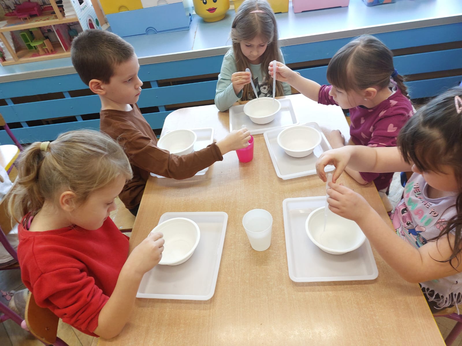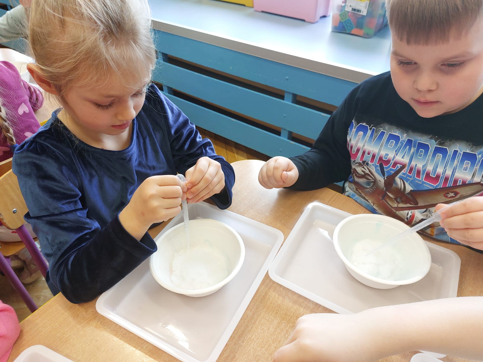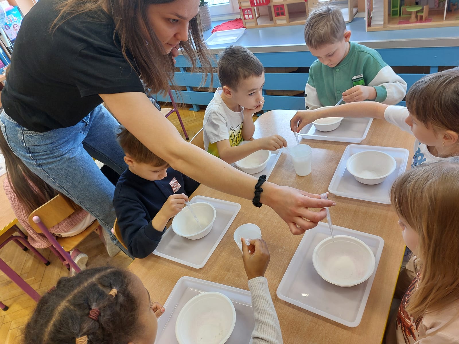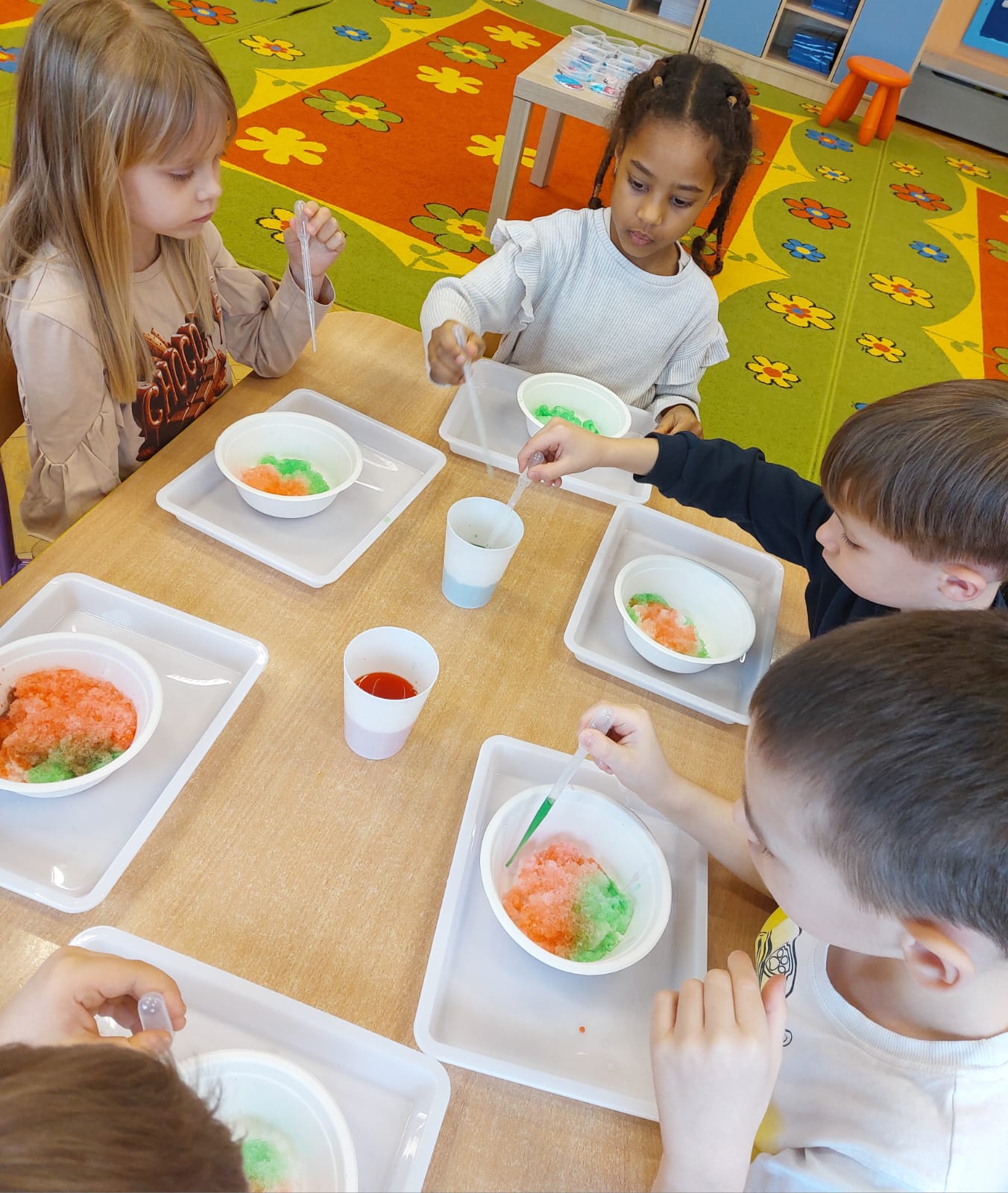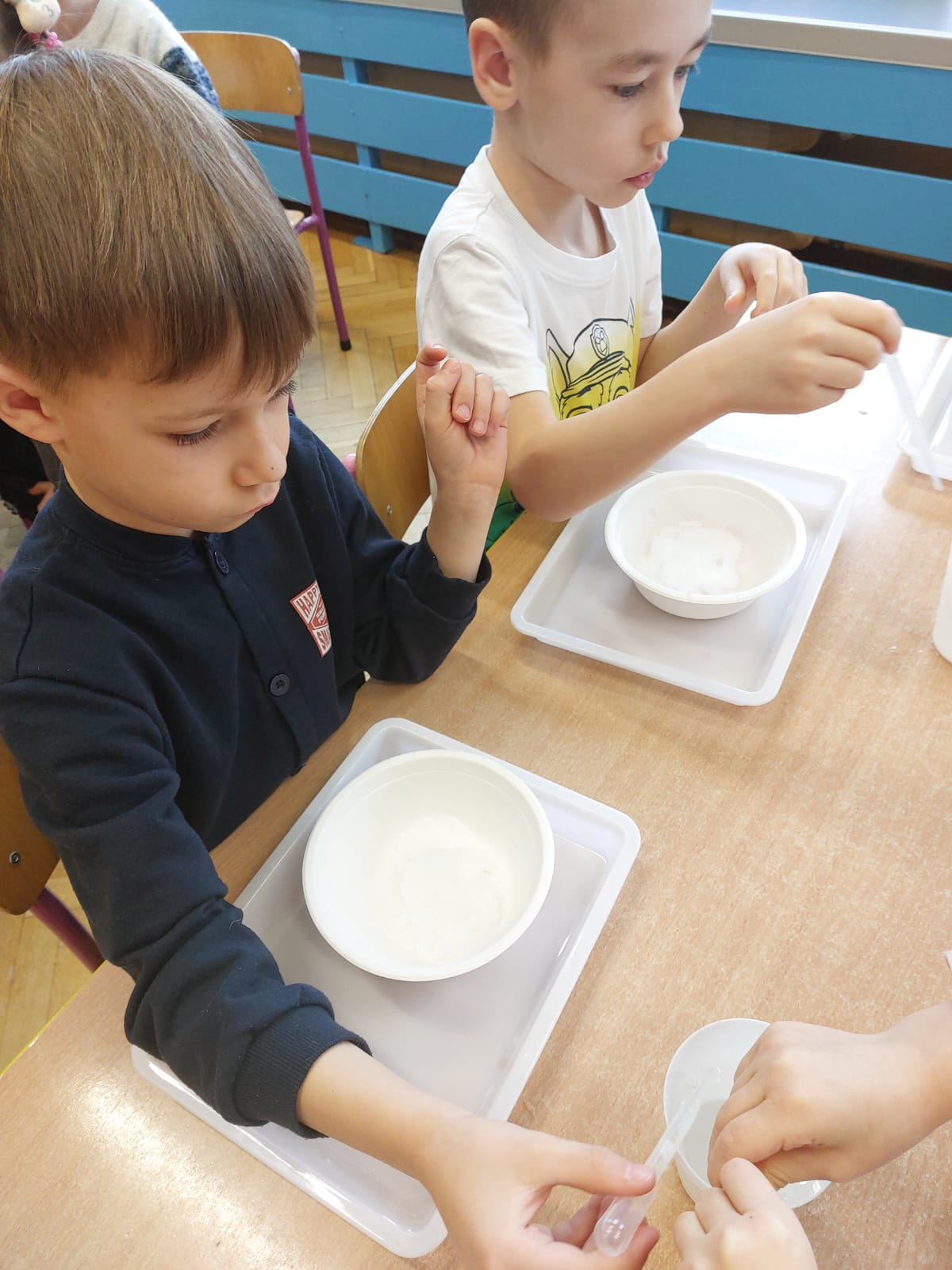 Zima to doskonały czas na odkrywanie fascynujących zjawisk przyrodniczych! Dzieci z grupy V miały okazję dziś uczestniczyć w niezwykłych eksperymentach, które wywołały prawdziwy efekt WOW! Dzięki nim nauka stała się świetną zabawą, a mali odkrywcy byli zachwyceni. Dzisiejsze eksperymenty to „kolorowe śnieżynki” i „sztuczny śnieg”. Pierwszy z nich polegał na połączeniu kleju z barwnikiem i płynem do naczyń, co dało piękne kolorowe płatki. Drugi eksperyment polegał na stworzeniu sztucznego białego i kolorowego śniegu, który po połączeniu poliakrylu sodu z wodą był biały, następnie dzieci dodały kolorowy barwnik, który zmienił śnieg w kolor. To były prawdziwe czary…. Te zimowe eksperymenty pokazały dzieciom, że nauka może być ekscytująca i pełna niespodzianek! To była świetna okazja do rozwijania kreatywności oraz zdobywania wiedzy poprzez zabawę.