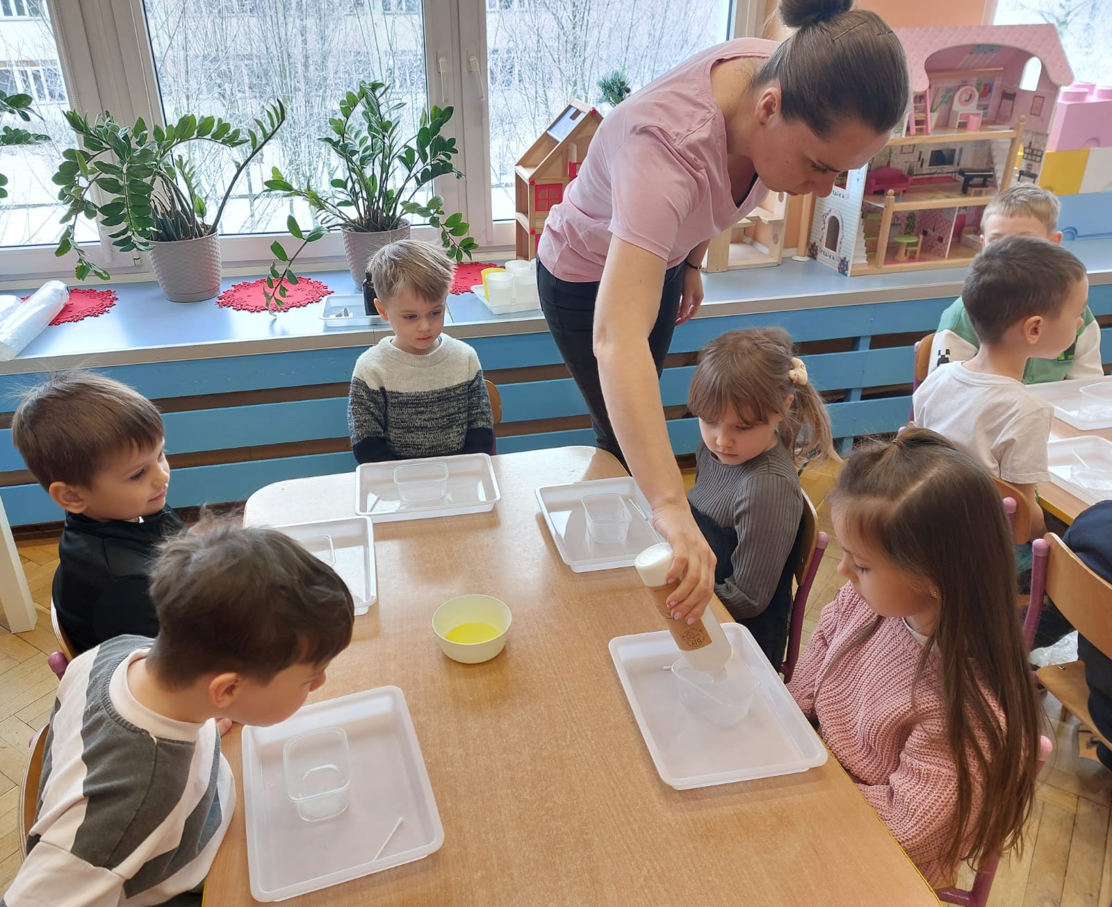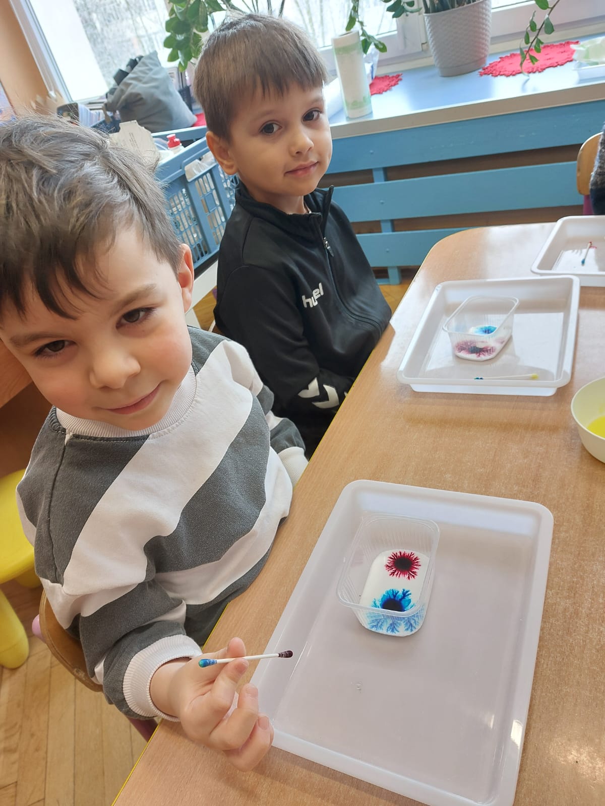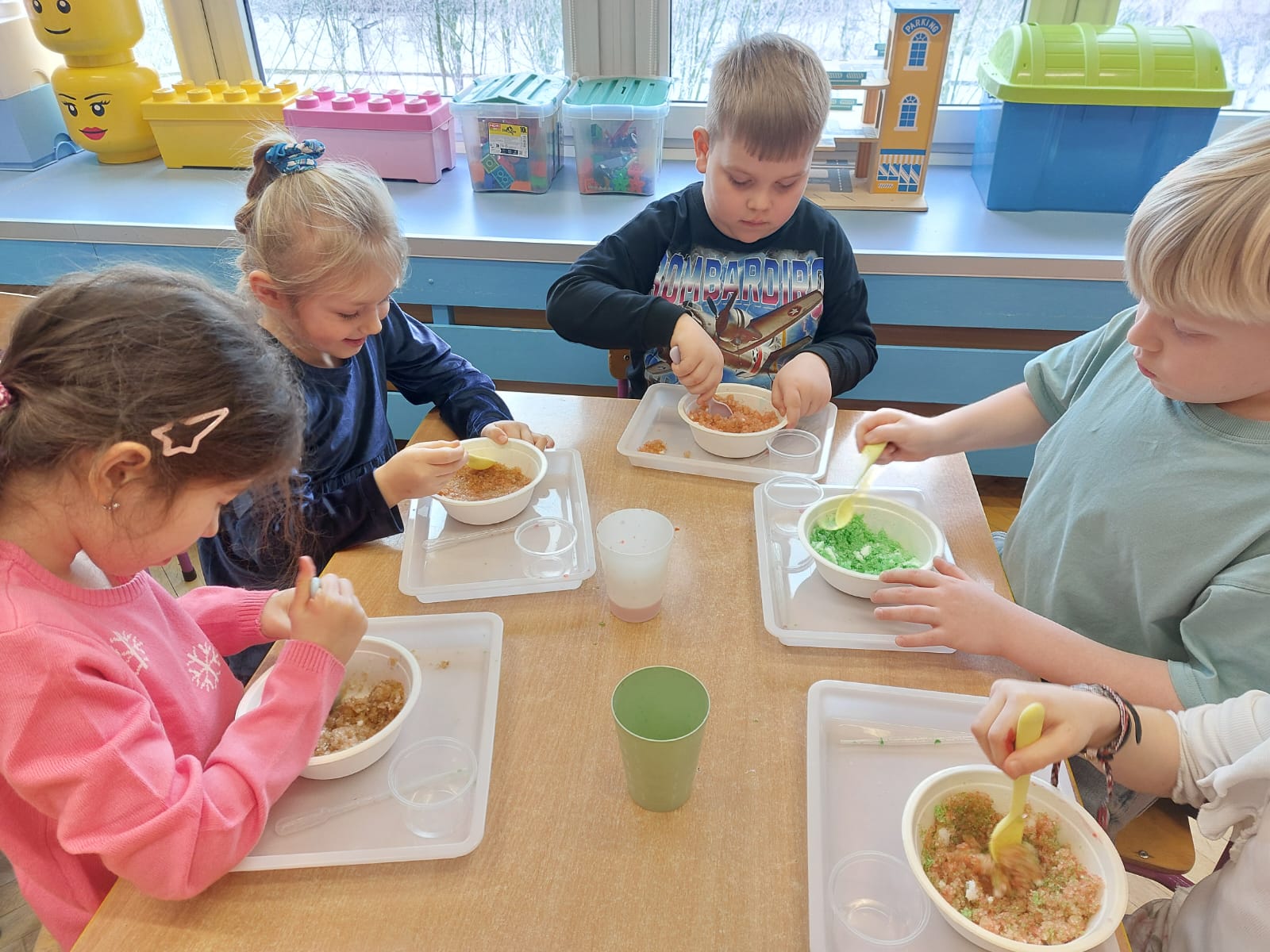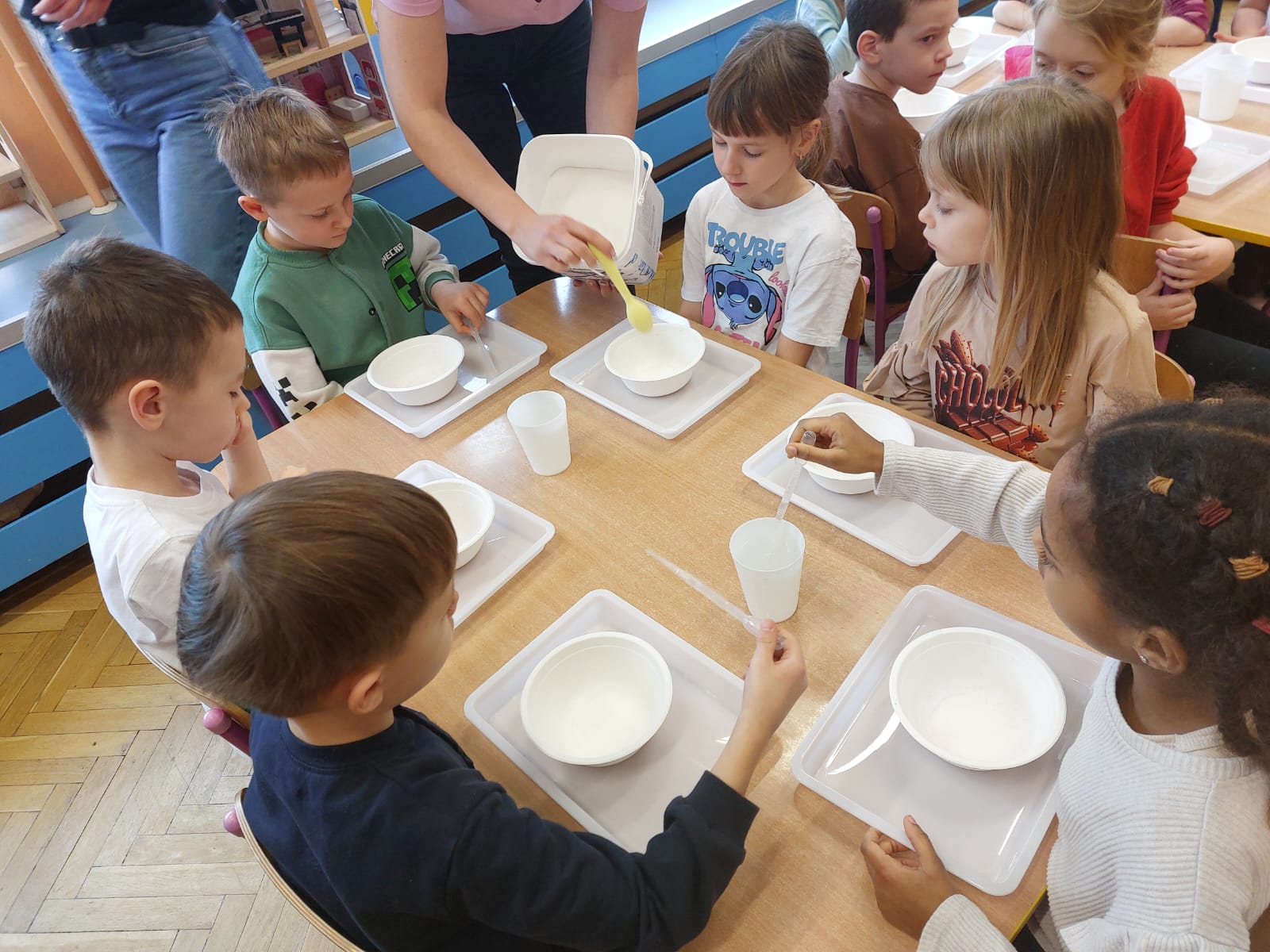 Zima to doskonały czas na odkrywanie fascynujących zjawisk przyrodniczych! Dzieci z grupy V miały okazję dziś uczestniczyć w niezwykłych eksperymentach, które wywołały prawdziwy efekt WOW! Dzięki nim nauka stała się świetną zabawą, a mali odkrywcy byli zachwyceni. Dzisiejsze eksperymenty to „kolorowe śnieżynki” i „sztuczny śnieg”. Pierwszy z nich polegał na połączeniu kleju z barwnikiem i płynem do naczyń, co dało piękne kolorowe płatki. Drugi eksperyment polegał na stworzeniu sztucznego białego i kolorowego śniegu, który po połączeniu poliakrylu sodu z wodą był biały, następnie dzieci dodały kolorowy barwnik, który zmienił śnieg w kolor. To były prawdziwe czary…. Te zimowe eksperymenty pokazały dzieciom, że nauka może być ekscytująca i pełna niespodzianek! To była świetna okazja do rozwijania kreatywności oraz zdobywania wiedzy poprzez zabawę.