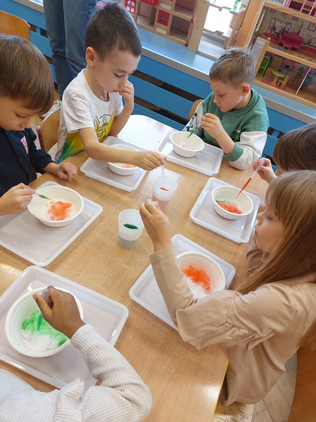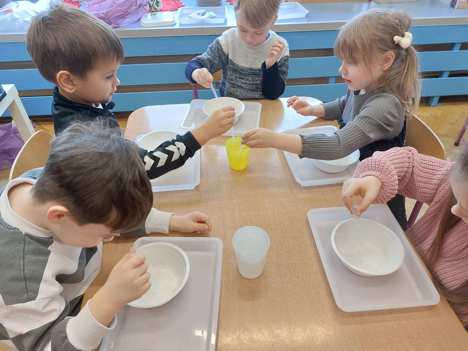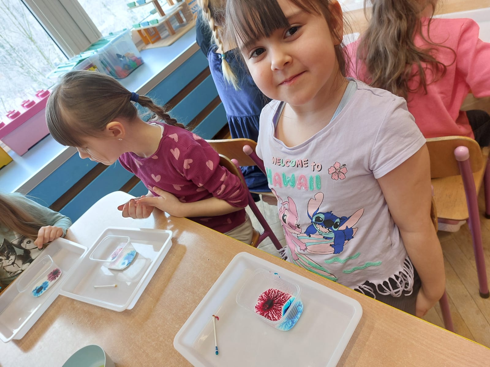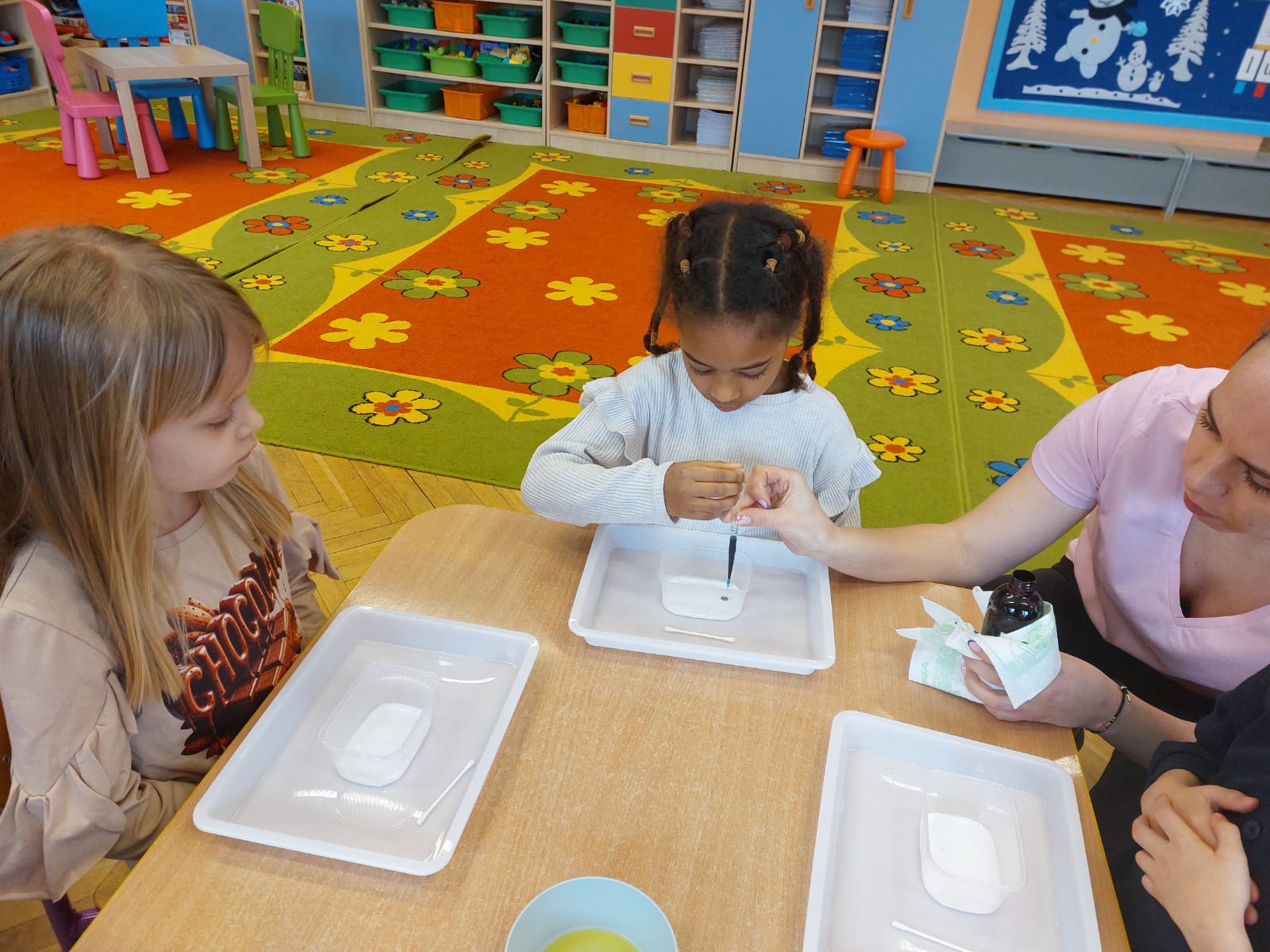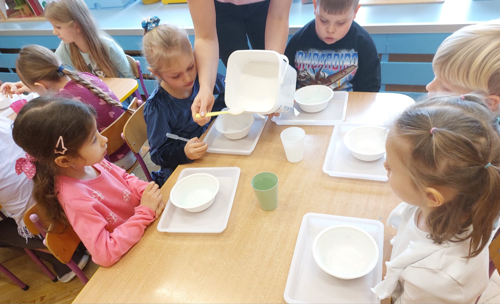 Zima to doskonały czas na odkrywanie fascynujących zjawisk przyrodniczych! Dzieci z grupy V miały okazję dziś uczestniczyć w niezwykłych eksperymentach, które wywołały prawdziwy efekt WOW! Dzięki nim nauka stała się świetną zabawą, a mali odkrywcy byli zachwyceni. Dzisiejsze eksperymenty to „kolorowe śnieżynki” i „sztuczny śnieg”. Pierwszy z nich polegał na połączeniu kleju z barwnikiem i płynem do naczyń, co dało piękne kolorowe płatki. Drugi eksperyment polegał na stworzeniu sztucznego białego i kolorowego śniegu, który po połączeniu poliakrylu sodu z wodą był biały, następnie dzieci dodały kolorowy barwnik, który zmienił śnieg w kolor. To były prawdziwe czary…. Te zimowe eksperymenty pokazały dzieciom, że nauka może być ekscytująca i pełna niespodzianek! To była świetna okazja do rozwijania kreatywności oraz zdobywania wiedzy poprzez zabawę.
