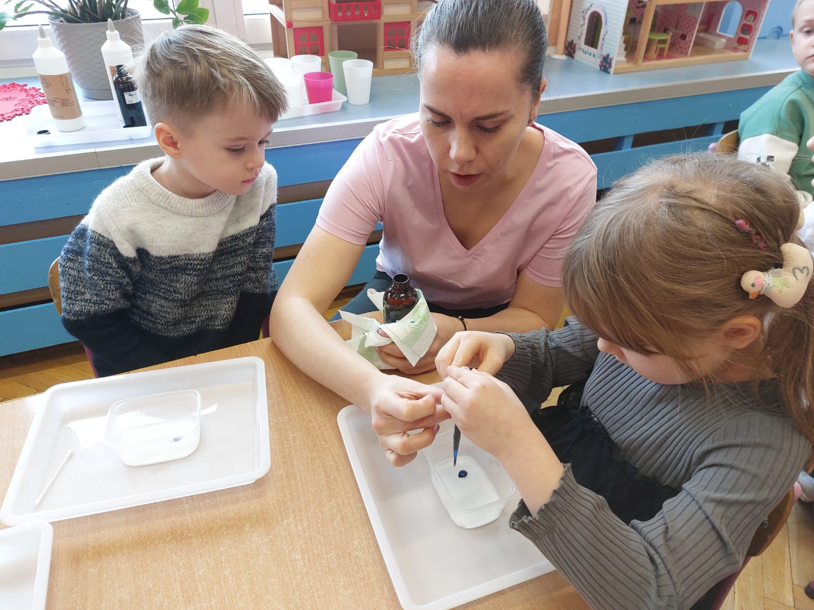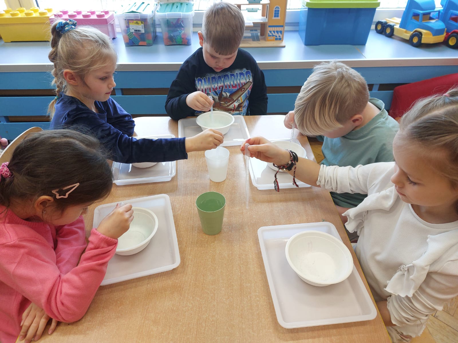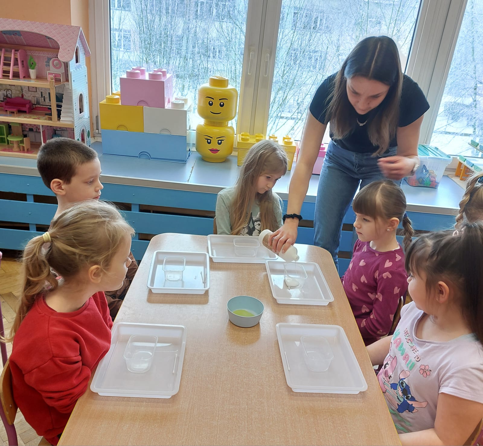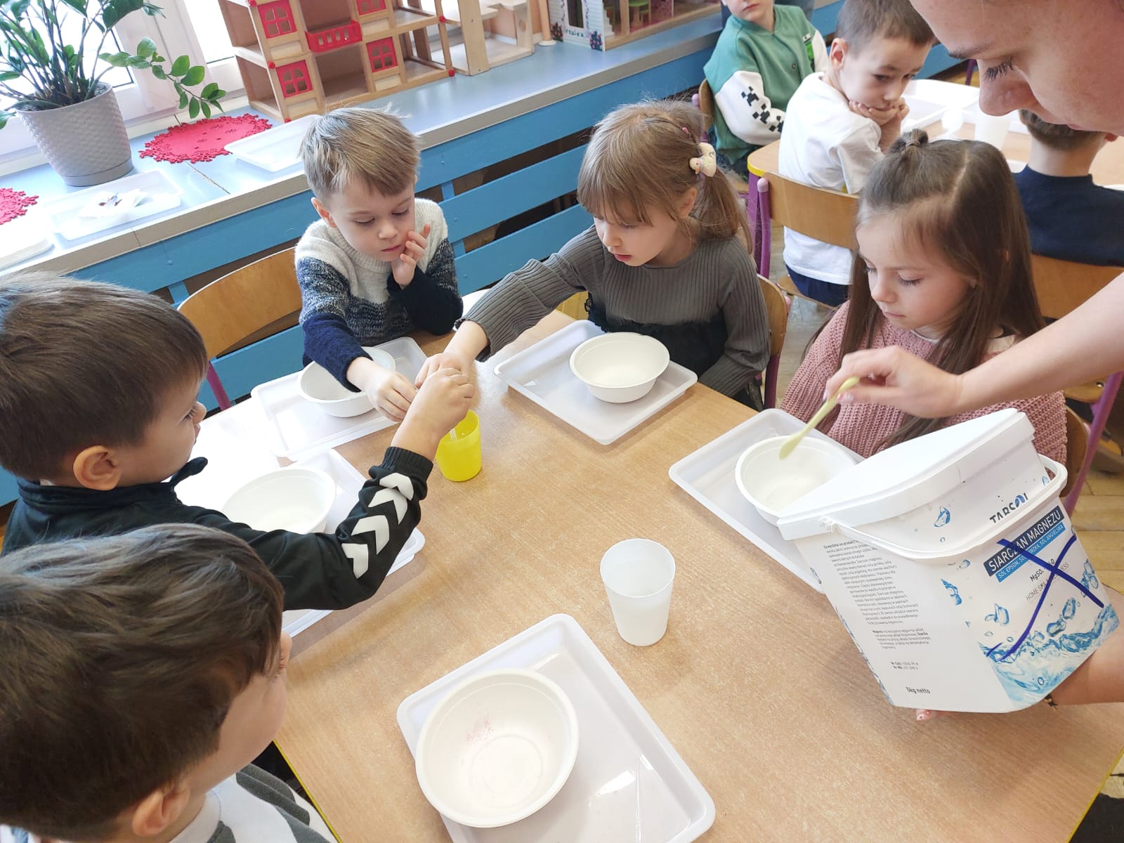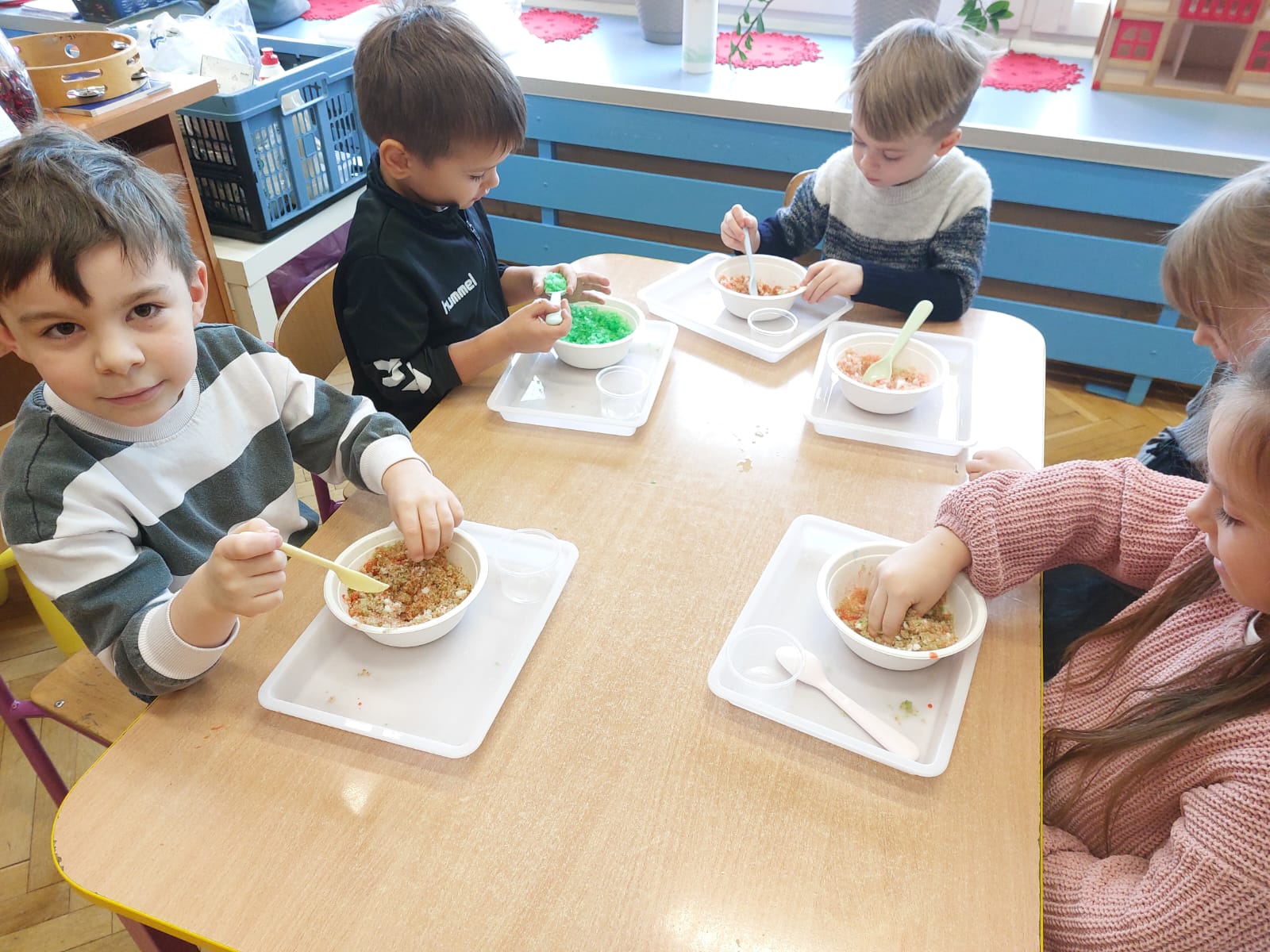 Zima to doskonały czas na odkrywanie fascynujących zjawisk przyrodniczych! Dzieci z grupy V miały okazję dziś uczestniczyć w niezwykłych eksperymentach, które wywołały prawdziwy efekt WOW! Dzięki nim nauka stała się świetną zabawą, a mali odkrywcy byli zachwyceni. Dzisiejsze eksperymenty to „kolorowe śnieżynki” i „sztuczny śnieg”. Pierwszy z nich polegał na połączeniu kleju z barwnikiem i płynem do naczyń, co dało piękne kolorowe płatki. Drugi eksperyment polegał na stworzeniu sztucznego białego i kolorowego śniegu, który po połączeniu poliakrylu sodu z wodą był biały, następnie dzieci dodały kolorowy barwnik, który zmienił śnieg w kolor. To były prawdziwe czary…. Te zimowe eksperymenty pokazały dzieciom, że nauka może być ekscytująca i pełna niespodzianek! To była świetna okazja do rozwijania kreatywności oraz zdobywania wiedzy poprzez zabawę.